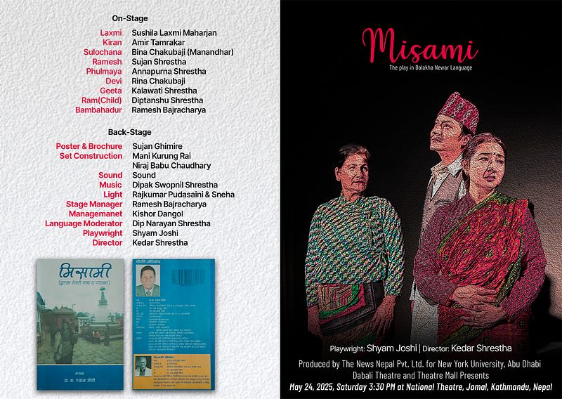 Misāmi is a play written in the Dolakhā Newār language by Prof. Shyām Joshi in the early 1970s. It is centered on the life of a typical village family in Nepāl and raises issues that are still relevant today, such as the role of women in society and interpersonal family dynamics. The play was performed only once, in Dolakhā, shortly after it was written. In 2024, Dr. Joshi, with the assistance of Dr. Hari Darshan Shrestha and Mr. Amar Kumar Pradhan, published the play in book form, including Nepali translation. This raised the idea of re-staging the play, which resulted in a community-wide effort, which I was honored to participate in. The complete play was performed at the National Theater in Kathmandu on May 24, 2025.  It was designed to authentically project the Dolakhā culture, language, customs, costumes, and music of the 1970s. The theater was full and a number of people noted that it was the first time that they had ever seen a play performed in their language.